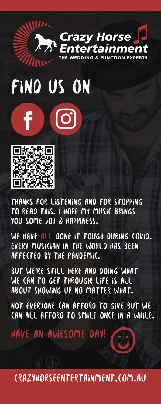 To busk in our contracted spots – you MUST have a pull up banner – we’ll supply this free of your first 2 gigs – after that you’re own your own – you must buy a banner from us with your artwork ( pic ) supplied by you for about what you make in 1 -2 hours busking.